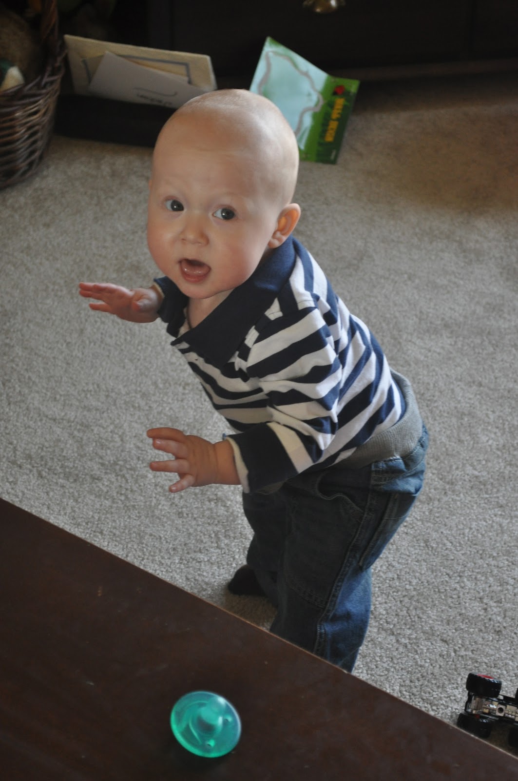 Jackson is standing up on his own and taking a few steps all by himself. I love it when he does something and has this surprised look on his face!