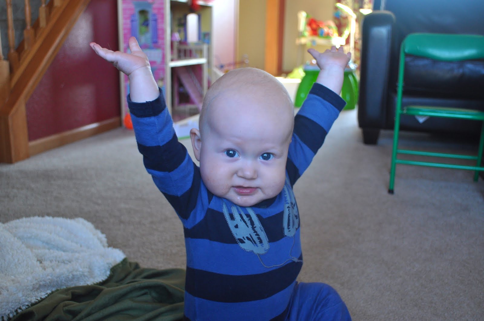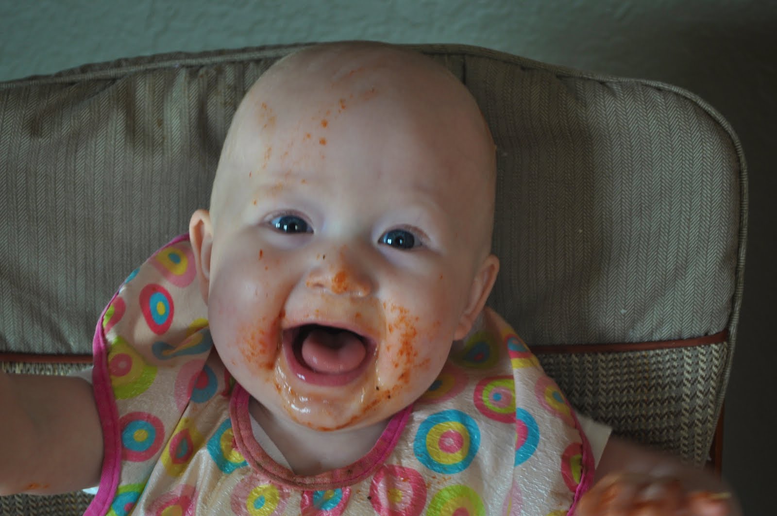 And he loves spaghetti!! Check out the handprint on his head π And now, he’s walking with help!!! He just started doing this today!!!