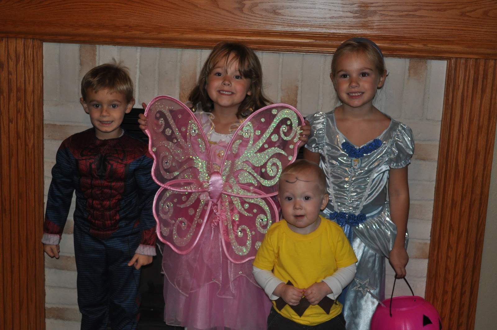 After the petting zoo, it was time for trick or treating. Charlie Brown and the Princess Fairy took to the town with Cinderella and Spiderman! What a group!